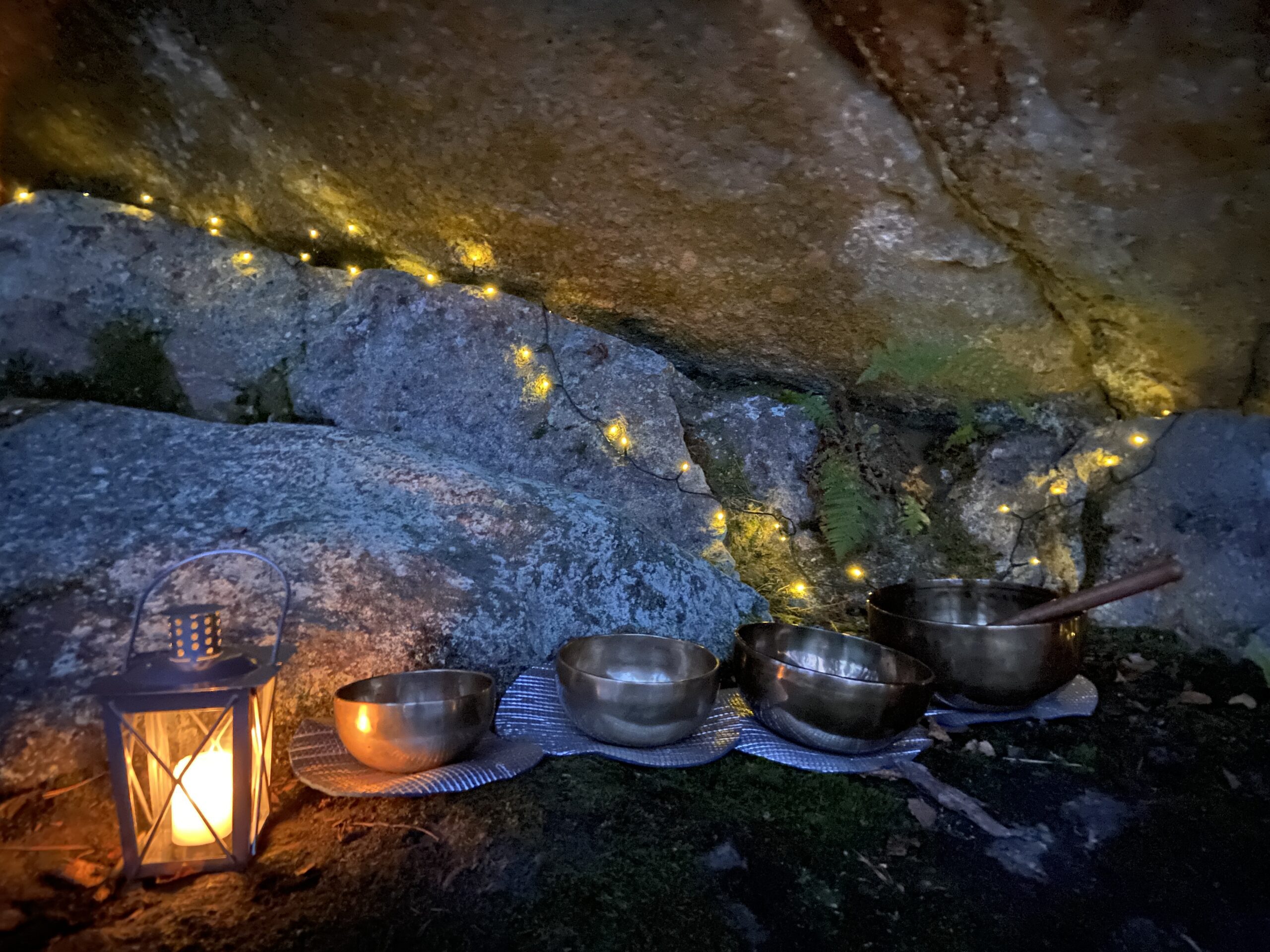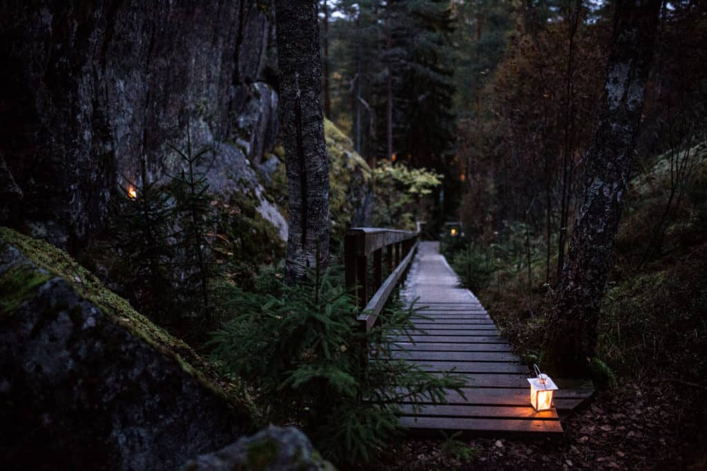 Hämärä metsä on valaistu lyhdyin ja kynttilöin. Tuli rätisee nuotiossa saaden varjot tanssahtelemaan puiden rungoilla ja oksilla. Kallion kylkeen heijastuu nuotion loimu. Makuupussin lämmössä luonnon keskellä on turvallista olla. Taivaalla tuikkivat tähdet.